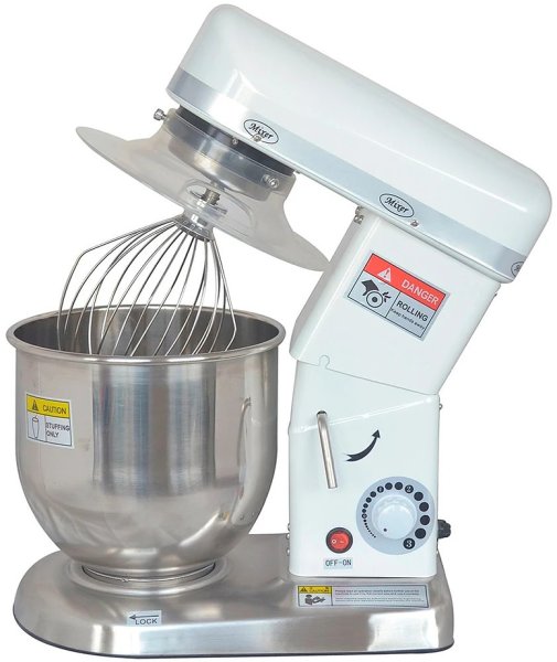 • Конструктивные особенности: планетарный привод; съёмная чаша 5 л с фиксатором; механизм подъёма чаши; сменные насадки (венчик, лопатка, крюк); защитный экран/кожух зоны работы; микровыключатель безопасности при открытом экране; термозащита двигателя; вентиляция привода; прорезиненные опоры для виброгасящей установки