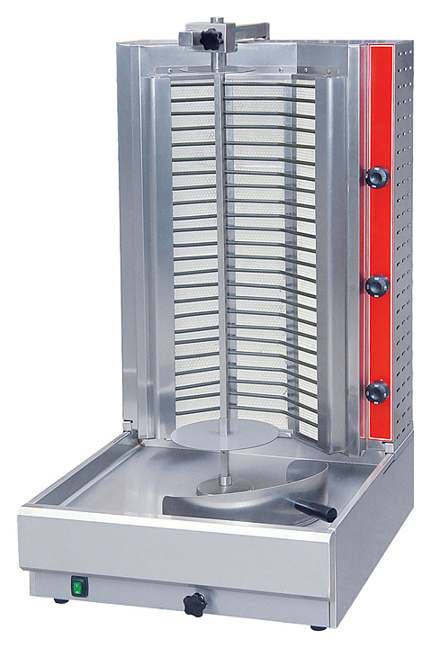 534x607x960мм, 8,1кВт, 380В, 31 кг, материал корпуса: нержавеющая сталь, длина шампура 650 мм, максимальная загрузка 30 кг, 3 зоны нагрева, 6 тэнов, наличие возможности регулирования расстояния между ТЭНами и шампуром, электропривод шампура, мотор снизу