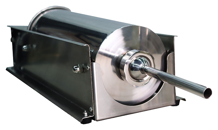 Надежная рабочая группа из нержавеющей стали AISI 304 для контакта с пищей; горизонтальная ориентация облегчает подачу плотного фарша и упрощает загрузку; точный контроль подачи за счет винтового привода; отсутствие электропривода позволяет использовать оборудование на любой производственной линии без привязки к электросети; простая разборка и доступ к узлам для оперативной санитарной обработки; совместимость с распространенными типами колбасных оболочек, применяемых в HoReCa.