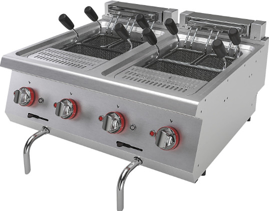 Габариты 800*730*280, вес 40 кг, сечение кабеля 5x4 мм. Макароноварка изготовлена из нержавеющей стали, толщина покрытия 15/10 мм. 2 ванны по 13 литров. Контроль температуры осуществляется при помощи термостата. Трёхуровненый переключатель температуры. Оснащена краном для подачи воды, автоматической системой заполнения ванны водой, клапаном слива. Мощность 15000 Вт, габариты в упаковке 820*800*580, вес брутто 49 кг, 380 В. В комплект входят корзины для каждой ванны: 1/3х1шт, 1/6 правая х1 шт, 1/6 левая х1шт.